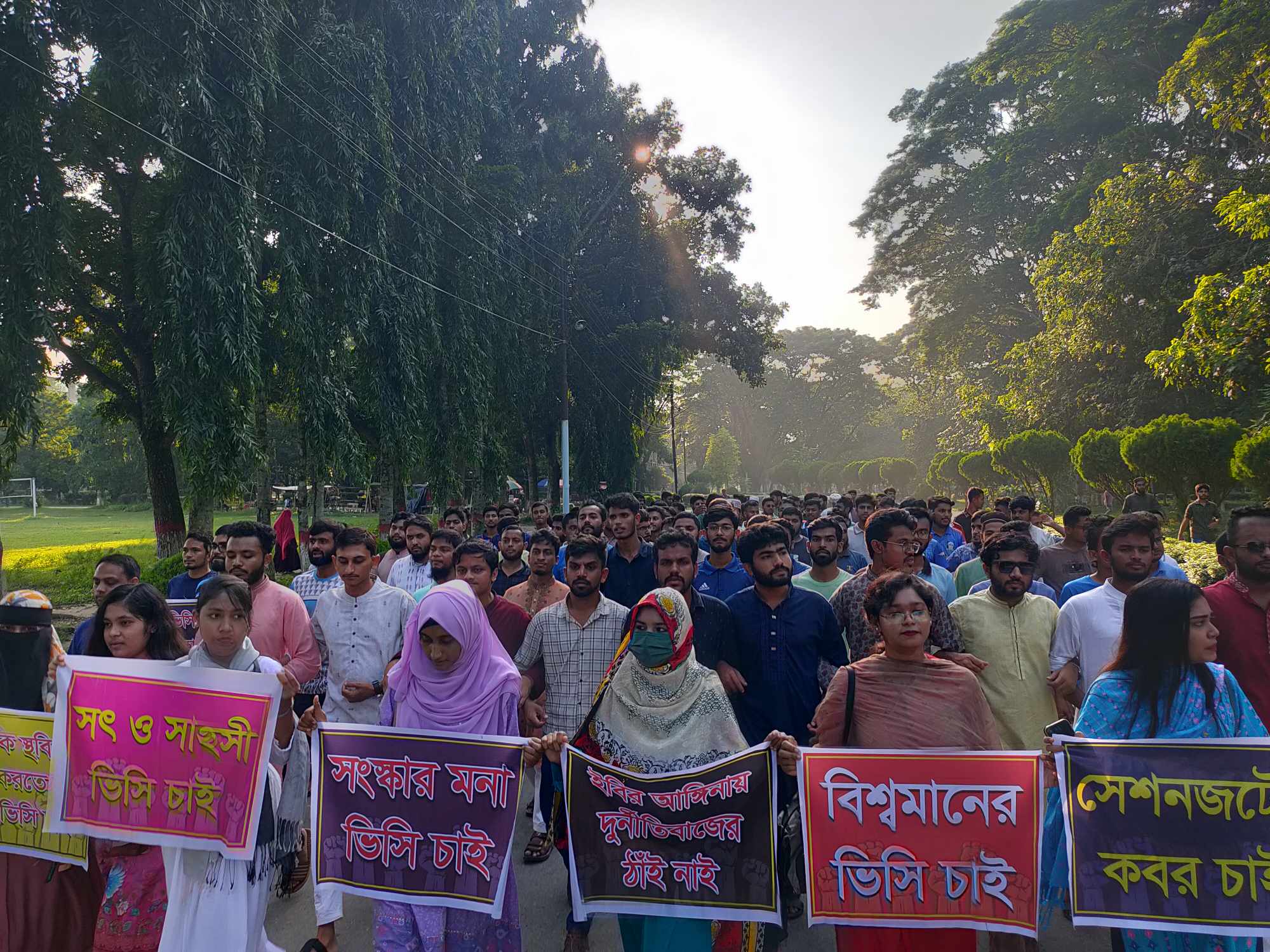এসময় তারা 'সবাই যখন স্বর্গে ইবি কেন মর্গে', 'ভিসি ভিসি ভিসি চাই, ইবিতে ভিসি চাই', ভিসি নিয়ে নয় ছয়, আর নয় আর নয়', 'ঢাবি, রাবি ভিসি পায়, ইবি কেন পিছিয়ে রয়', 'সংস্কারমনা ভিসি চাই' 'দুর্নীতিমুক্ত ভিসি চাই', 'সৎ ও সাহসী ভিসি চাই', 'সেশনজটর কবর চাই' সহ বিভিন্ন শ্লোগান দেয়।