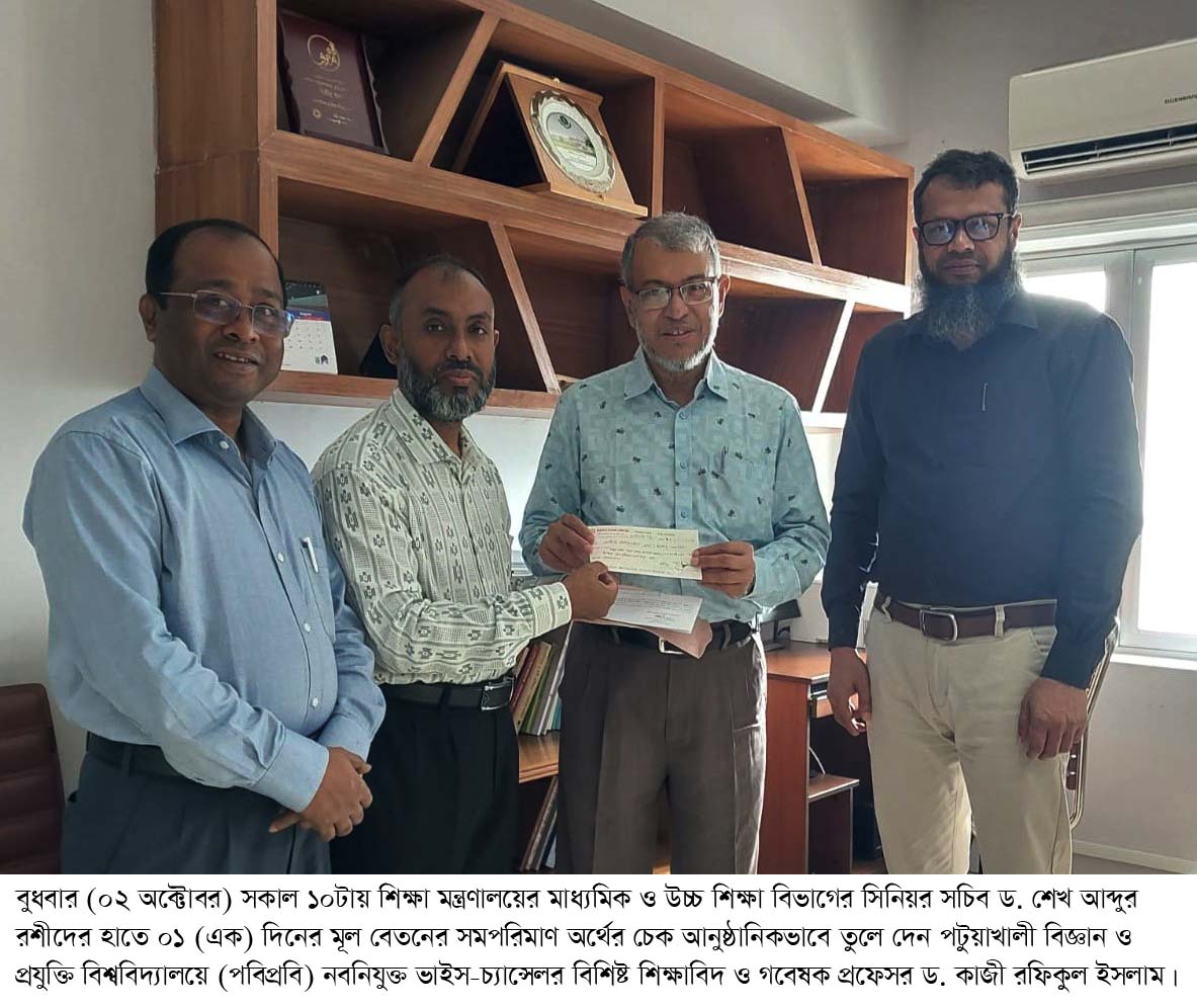 বুধবার (২ অক্টোবর) সকাল ১০টায় শিক্ষা মন্ত্রণালয়ের মাধ্যমিক ও উচ্চ শিক্ষা বিভাগের সিনিয়র সচিব ড. শেখ আব্দুর রশীদের হাতে উক্ত অর্থের চেক আনুষ্ঠানিকভাবে তুলে দেন পটুয়াখালী বিজ্ঞান ও প্রযুক্তি বিশ্ববিদ্যালয়ের (পবিপ্রবি) নবনিযুক্ত ভাইস-চ্যান্সেলর বিশিষ্ট শিক্ষাবিদ ও গবেষক প্রফেসর ড. কাজী রফিকুল ইসলাম।